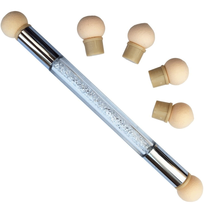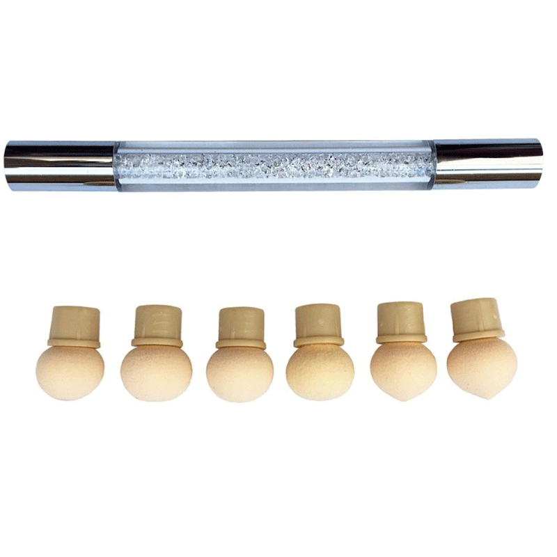 Данный инструмент представляет собой очень удобную двустороннюю ручку-стилус со сменными подушечками сферической формы. Благодаря двум рабочим частям, можно работать сразу несколькими цветами декоративных материалов. Такая кисть идеальная для создания омбре и градиента. Она подходит для создания удивительных нейл-композиций, которые по уровню сложности не уступают рисункам, которые сделаны аэрографом. Аэропуф – лучшее решение для дизайнов с использованием трафаретов. В комплекте имеются 6 сменных спонжей.