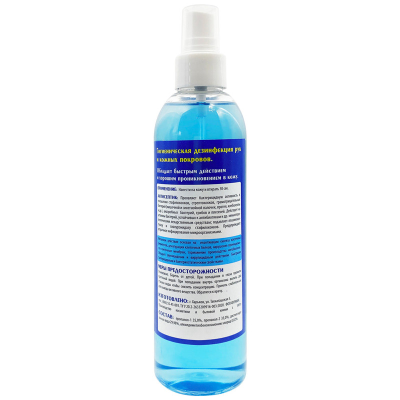 Состав: спирт (70%), дистиллированная вода, алкилдиметилбензиламмоний хлорид.