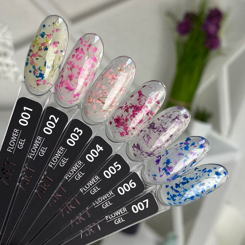 ART Flower Gel – гель для дизайна ногтей, который содержит натуральные сухоцветы. По консистенции это, что то среднее между гелем и гель-лаком. Гель представлен в баночке без кисти, что позволяет удобно набрать необходимое количество для последующего распределения. Гель хорошо наносится и легко распределяется по ногтевой пластине.
