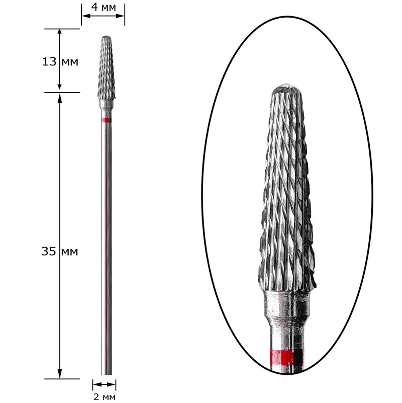 Коническая твердосплавная фреза H_706fk средних размеров для уменьшения толщины материала при коррекции искусственных ногтей.