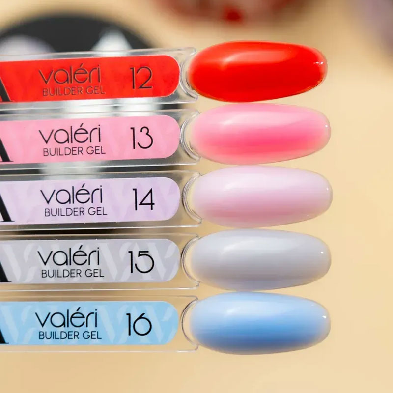Valeri Builder Gel Collection – это коллекция гелей, которые используются как для наращивания ногтей, так и для коррекции и укрепления ногтевой пластины. Гели низкотемпературные, твердые, средней плотности (гель Valeri 3-5 имеют немного более редкую консистенцию) за счет чего очень хорошо самовыравниваются, но не затекают. Пигментация – средняя. Легкие в нанесении и хорошо держат арку ногтя.