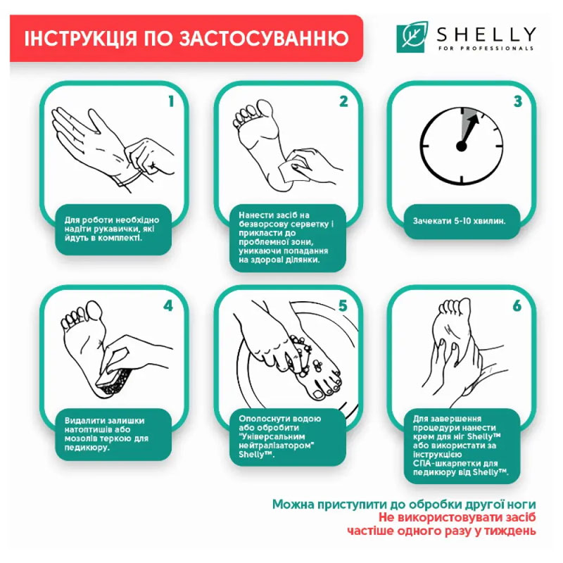 Время воздействия - 5-10 минут. По его истечении стопы следует обработать педикюрной теркой, после - ополоснуть водой или воспользоваться универсальным нейтрализатором Shelly. Завершить процедуру рекомендуется нанесением увлажняющего крема.