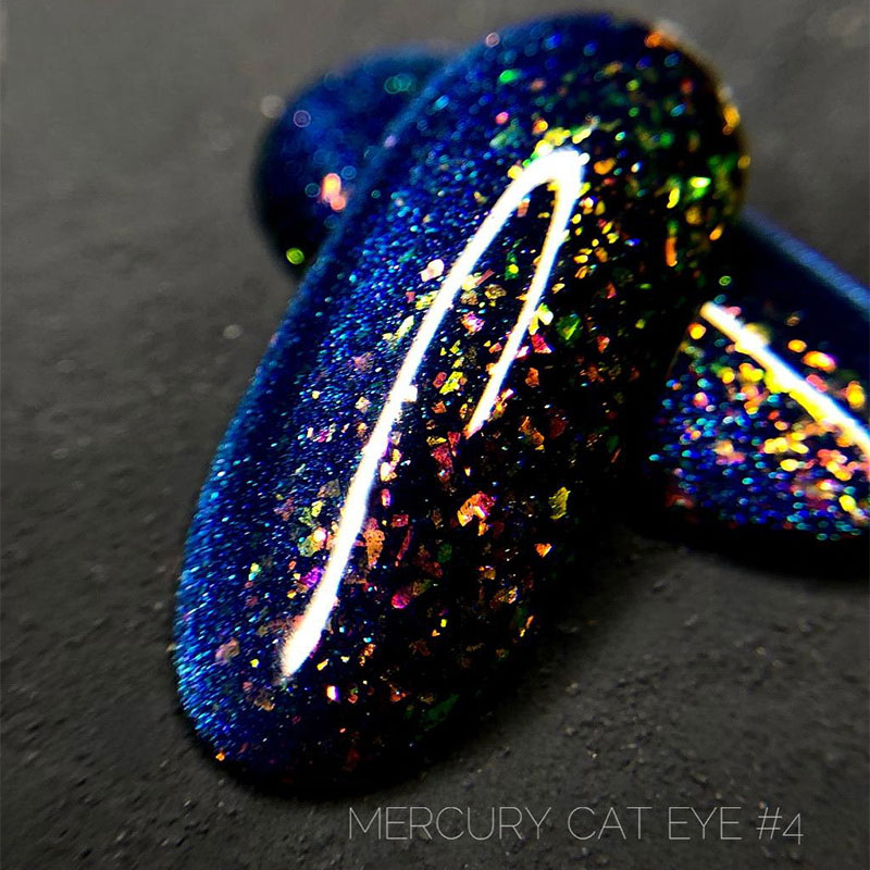 Crooz Cat Eye Mercury - гель-лаки с волшебным эффектом "кошачий глаз". В их текстуре также присутствуют частички фольги и/или потали, благодаря которым блик усиливается цветными переливами. Эти гель-лаки наносятся на подложку любых цветов и позволяют всегда получать разные оттеночные нюансы. Для создания блика нужно воспользоваться магнитом, однако эта коллекция очень красиво смотрится и без него.