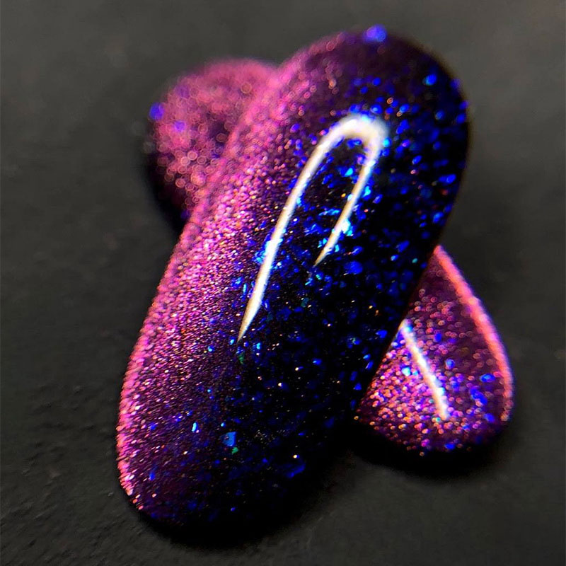 Crooz Cat Eye Mercury - гель-лаки с волшебным эффектом "кошачий глаз". В их текстуре также присутствуют частички фольги и/или потали, благодаря которым блик усиливается цветными переливами. Эти гель-лаки наносятся на подложку любых цветов и позволяют всегда получать разные оттеночные нюансы. Для создания блика нужно воспользоваться магнитом, однако эта коллекция очень красиво смотрится и без него.