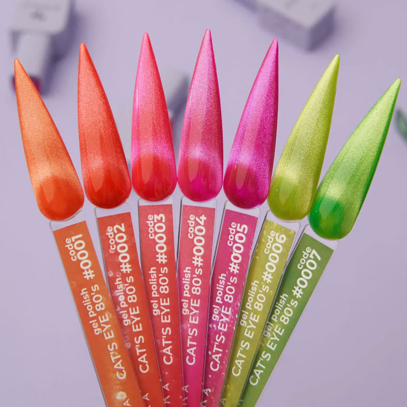 Коллекция ярких гель-лаков с эффектом кошачьего глаза и сатиновым мерцанием, напоминающим яркий наряд 80-х. Уникальная коллекция гель-лаков светится во тьме и выглядит просто невероятно. Гель-лаки из коллекции выглядят красиво как с эффектом от магнита, так и без его применения. Гель-лаки насыщены и не требуют подложки из темного цвета. Сделают красивый эффект, если наносить в один слой на обычный цвет гель-лака, что подобен оттенку из коллекции. Яркие оттенки подчеркнут любой образ и создадут настроение и днем и ночью.