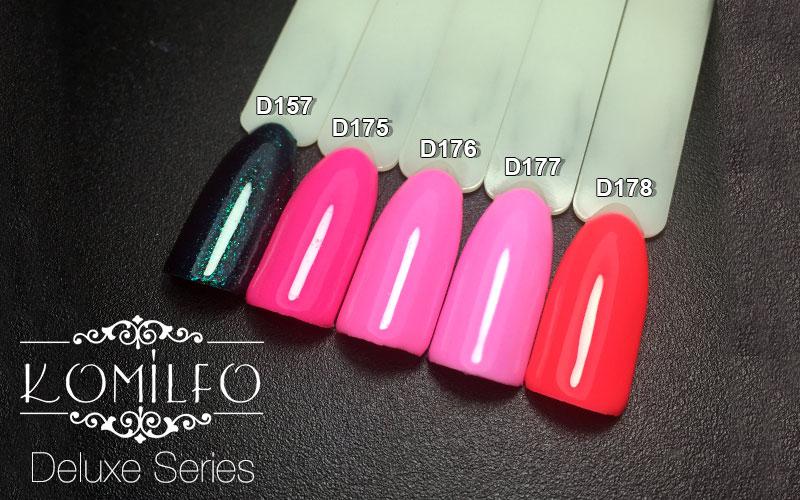 Komilfo Deluxe - это качественные, плотные гель-лаки, прекрасно наносятся по ногтевой пластине, не текут и не полосят. Хорошо сохраняют блеск покрытия и стойкость в процессе носки не меньше чем три недели. С данными гель-лаками вы не будете переживать о таких проблемах как отслойки и сколы. Благодаря широкой палитре цветов, которая подобрана высококвалифицированными специалистами и регулярно пополняется новыми коллекциями, вы всегда сможете найти себе нужный цвет и тон! Совместимы с товарами других брендов.