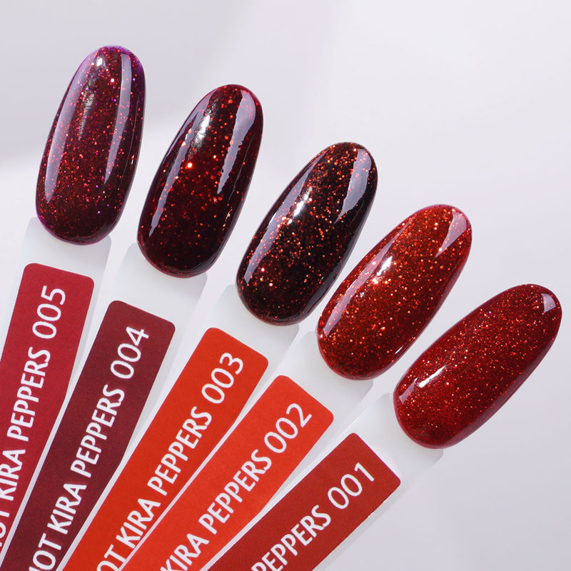 «Red Hot Kira Pappers» - новая пикантная коллекция гель-лаков этой осени от Kira Nails. Состоит из пяти красных оттенков с плотными блесточками, которые с легкостью можно равномерно распределить по ногтям и украсить их к любому мероприятию или дополнить ваш элегантный образ. Так же одними из преимуществ данных гель-лаков является отсутствие неприятного запаха, длитильное сохранение блеска и цвета.