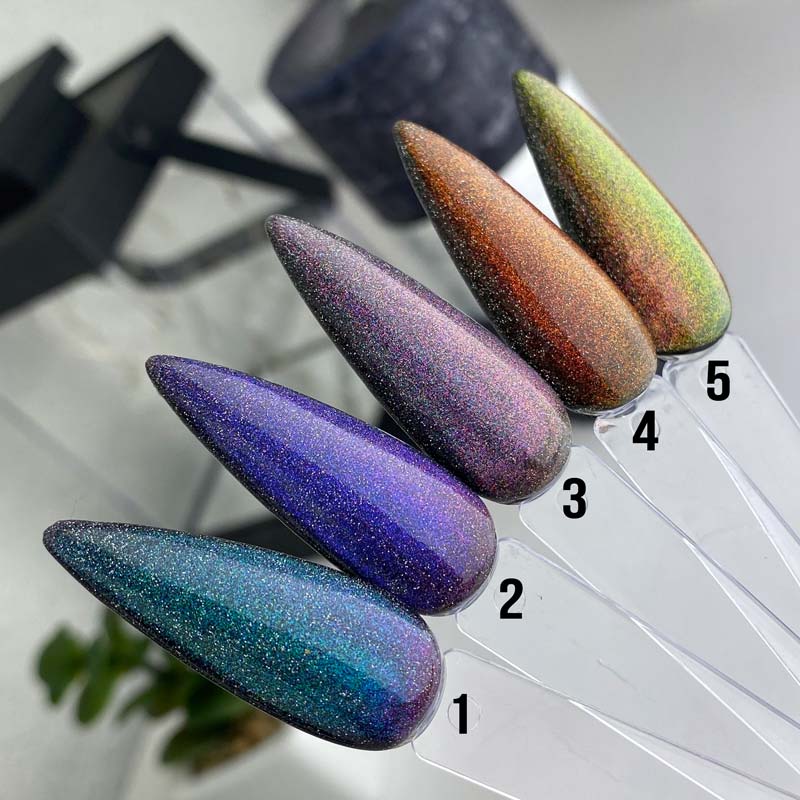 Наносить гель-лаки SAGA Cat Chameleon можно как с магнитом, чтобы получился мерцающий переливающийся блик-хамелеон, так и без него. Оба варианта демонстрируют самые яркие визуальные особенности декоративных покрытий и их изумительную сверкающую красоту.