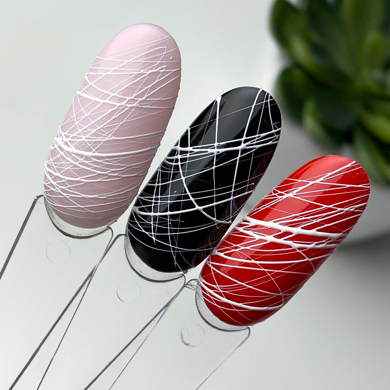Капля Spider Gelлегко трансформируется в тонкую ниточку, которая отлично ложится на ногтевую пластину в виде тонкой ровной линии. Незаменим для создания прямых тонких линий и геометрических дизайнов любой сложности.