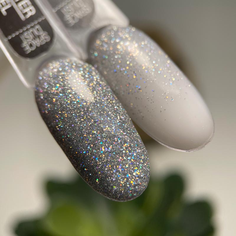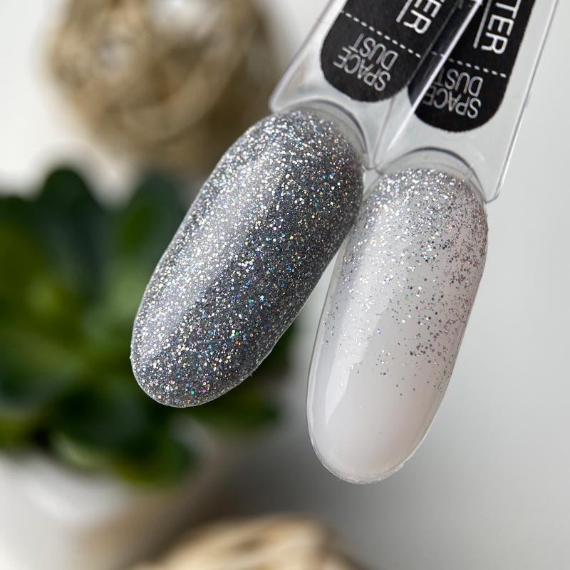 ART Space Dust Glitter Gel - это ослепительный гель для дизайна ногтей. Имеет густую, плотную консистенцию в составе которой содержатся голографические блесточки среднего помола. Используя данный гель вы получаете невероятное мерцание и ослепительный переливающийся блеск на ноготках.