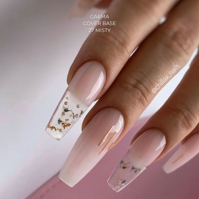 3. Нанесите втирающим слоем и разровняйте одну из прозрачных адгезивных баз Ga&Ma, чтобы ноготь был влажным, просушите и снимите липкий слой.