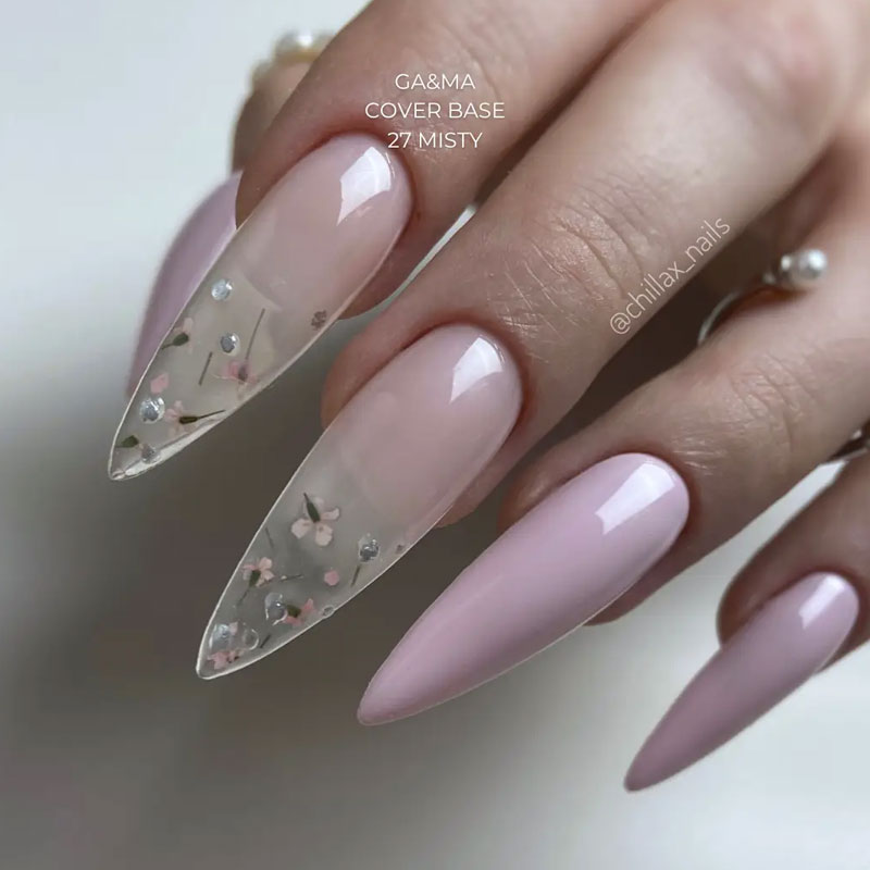 3. Нанесите втирающим слоем и разровняйте одну из прозрачных адгезивных баз Ga&Ma, чтобы ноготь был влажным, просушите и снимите липкий слой.