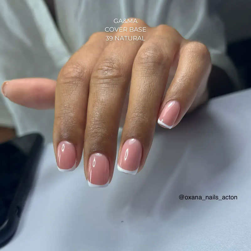 Natural 39 – классический светлый нюд. Плотно перекрывает свободный край, но оставляет полупрозрачный эффект.
