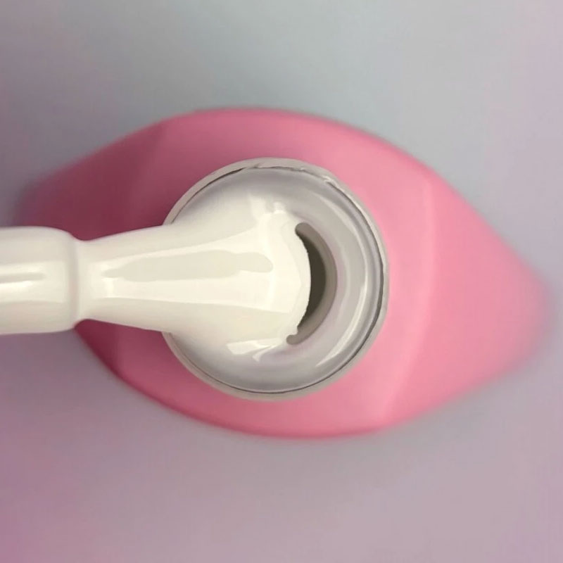 - Подкладку из Rubber Base лучше всего наносить плоской кистью для геля. Движения должны быть утирательными. Прорисовываем все пазухи ногтя и сушим в лампе 60 секунд.