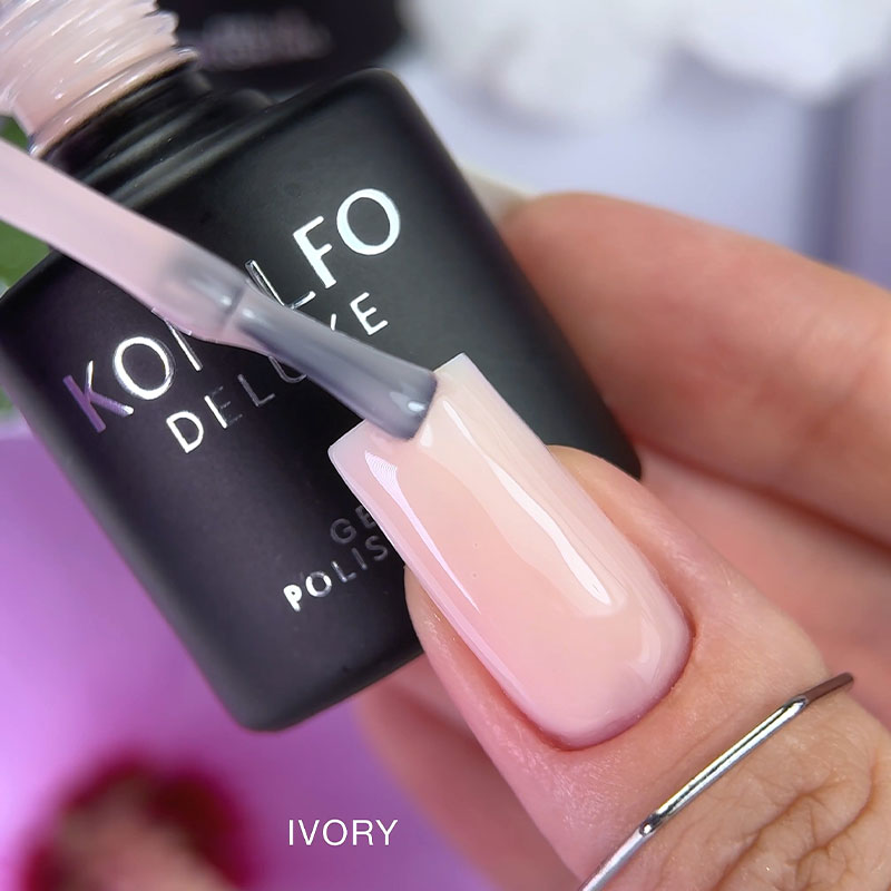 3. Нанесите один или два слоя цветной базы Komilfo. Время полимеризации каждого слоя в УФ-лампе – 2 минуты, в LED-лампе – 30 секунд.