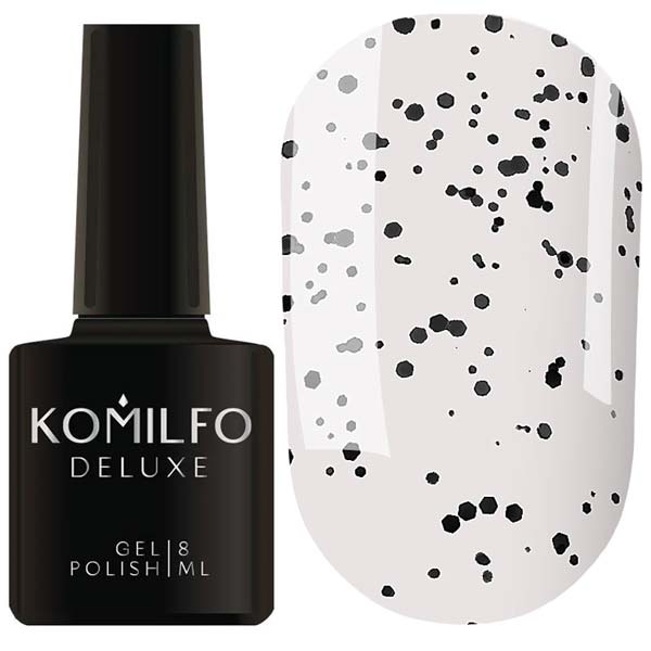 Топ с УФ-фильтрами, средней консистенции, не растекается. Мелкие точки создают впечатление экзотического фрукта. Идеально подходит как для светлых, так и для темных оттенков, а не скалывается и не выгорает. Так же подходит для дизайнов и очень выигрышно смотрится на френчевых оттенках.
