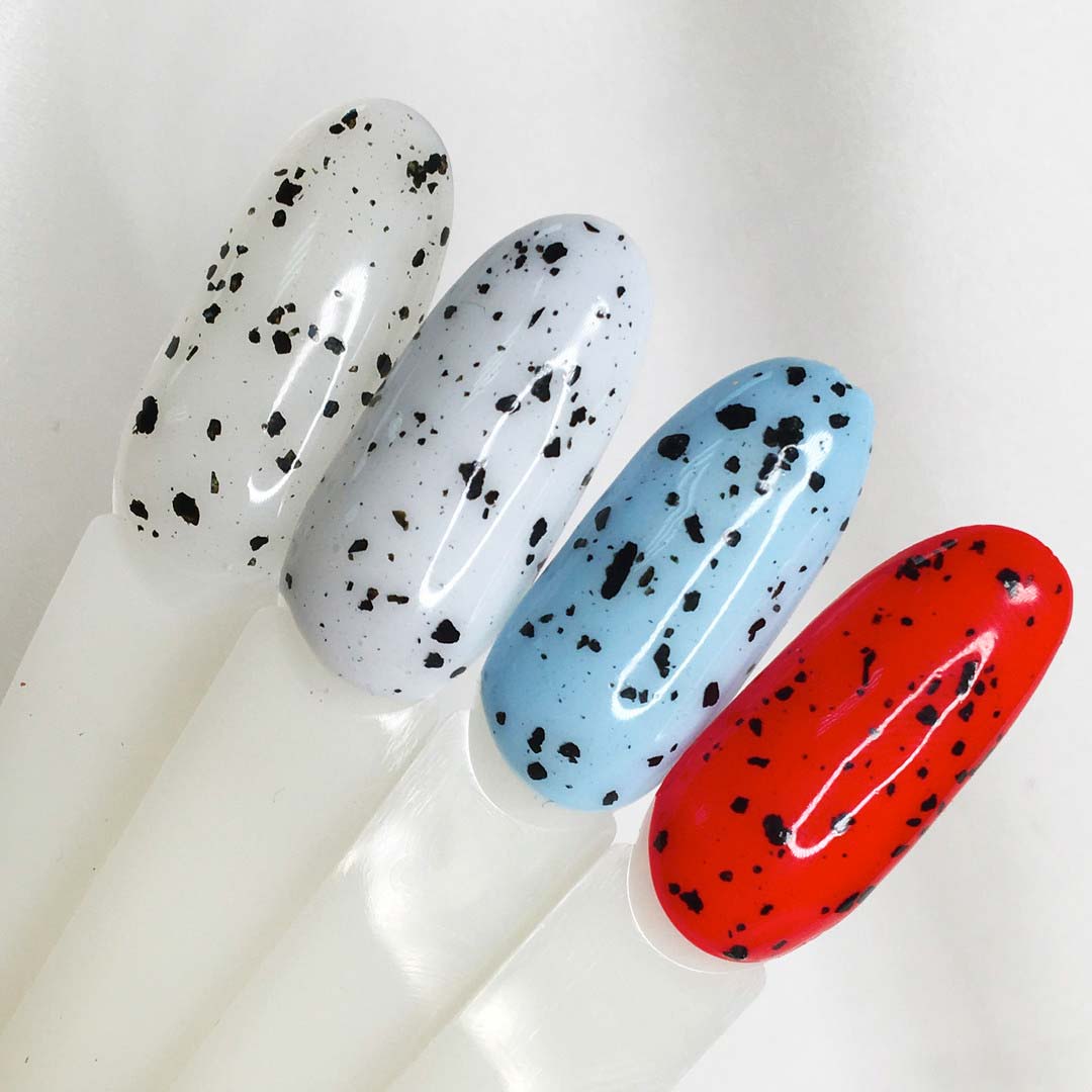 Глянцевый топ с УФ фильтром. Средней консистенции, приятный в нанесении, не затекает и легко самовыравнивается на ногтевой пластине. Он содержит разнообразные «рваные» черные частицы, не торчат и идеально подходит для любых цветных гель-лаков. Подходит для растяжек и градиента. Отличный вариант, чтобы разнообразить однотонный маникюр модным элементом.