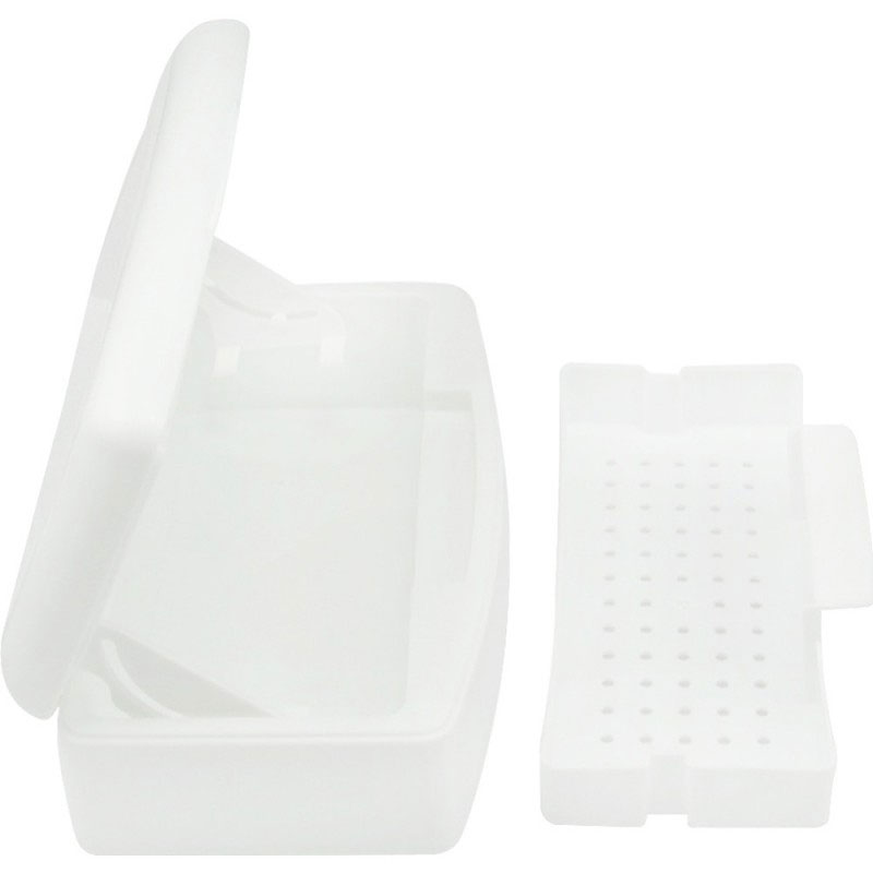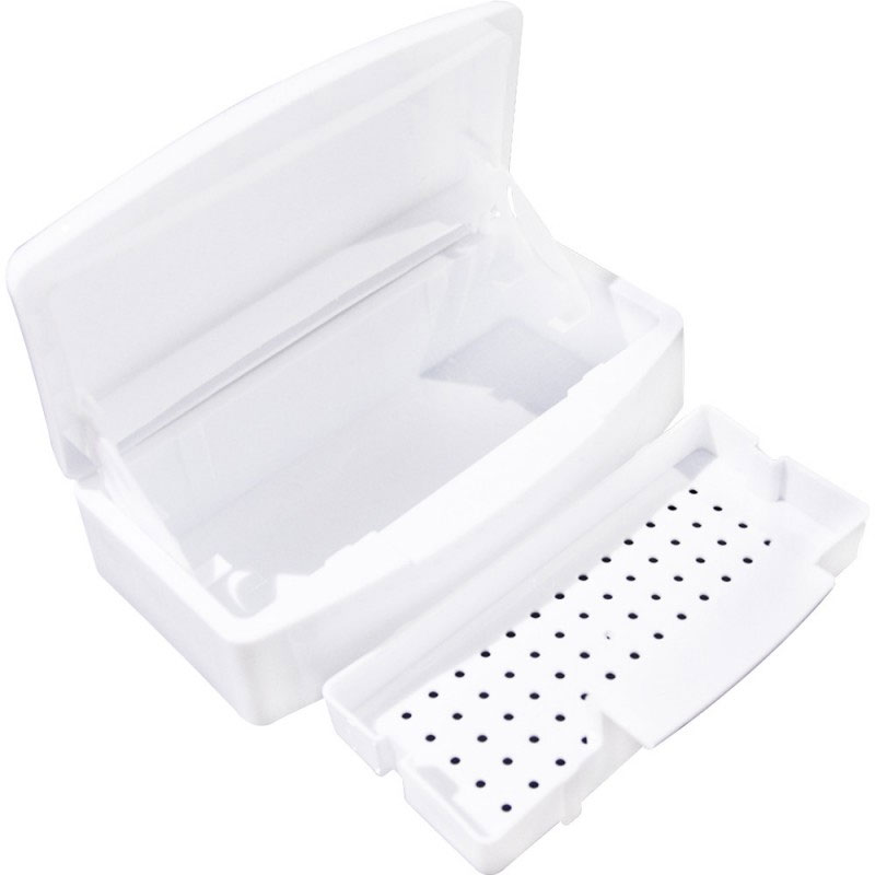Внутри контейнера имеется съемный поддон с перфорацией, который при необходимости можно вынуть и промыть в нем инструмент под проточной водой. Верхняя крышка при закрытии погружает поддон с инструментом дезинфицирующий раствор.
