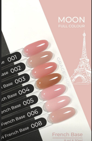 French Base MOON FULL - серия френч-баз представлена в 8 натуральных нюдовых оттенках. Очень нежно смотрится в маникюре, прекрасно подходит для френча.