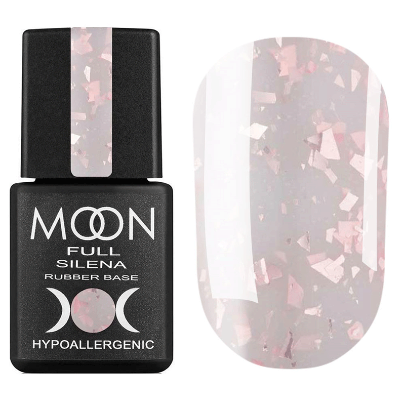 Каучуковая база с поталью Moon Full Silena Rubber Base выравнивает ногтевую пластину и одновременно покрывает ногти цветом. Вкрапление кусочков фольги в состав базы позволяет мастеру экономить материалы и время процедуры.