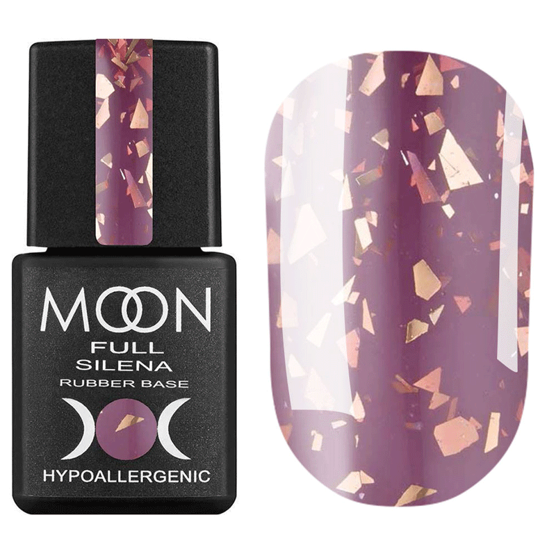 Каучуковая база с поталью Moon Full Silena Rubber Base выравнивает ногтевую пластину и одновременно покрывает ногти цветом. Вкрапление кусочков фольги в состав базы позволяет мастеру экономить материалы и время процедуры.