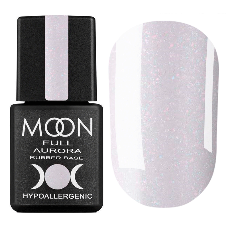 Каучуковая база Moon Full Aurora выравнивает ногтевую пластину и одновременно покрывает ногти цветом. Вкрапление мелкого разноцветного шиммера придает покрытию мерцающий блеск и изысканный вид.