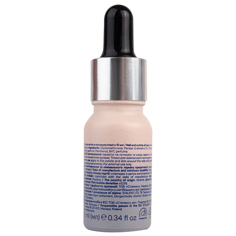 Масло для кутикулы и ногтей treat.s от Сталекс Про с натуральными компонентами глубоко питает, смягчает боковые валики и кожу у основания ногтя, восстанавливая ее структуру и защищая от появления заусенцев. После применения она мягкая, эластичная и бархатистая на ощупь. Благодаря нежной текстуре средство легко распределяется, быстро впитывается, не оставляя жирной пленки.