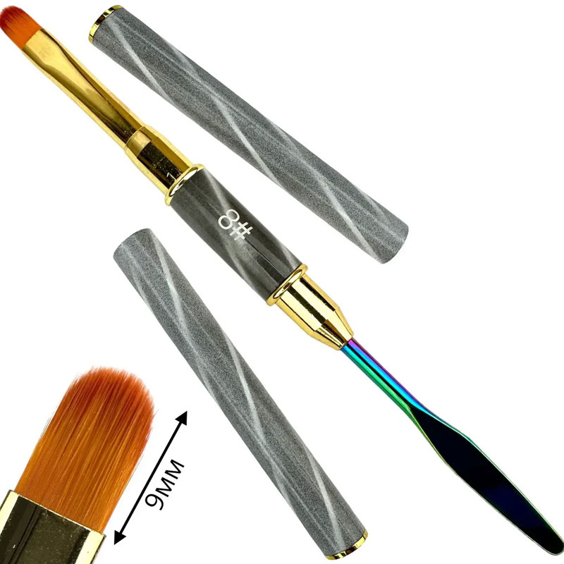 Инструмент представляет собой двусторонний пезель-шпатель для работы с полигелем, с одной стороны овальную плоскую кисть из искусственного ворса (для моделирования полигеля или акрила), с другой - шпатель для аккуратного отделения полигеля после выдавливания его из тюбика. Обе стороны кисти плотно закрываются колпачками.