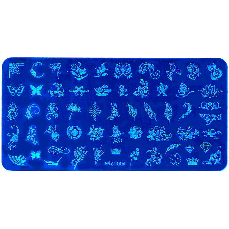 Металлические пластины для стемпинга используются как трафарет для переноса рисунка на ноготь, данная технология называется Стемпинг, и для работы с этой техникой понадобятся: Краска или гель-краска для стемпинга, силиконовый штамп и пластина для стемпинга. Платы для стемпинга mArt изготовлены из качественного металла и имеют правильную глубину насечки, что поможет сделать четкий рисунок, даже самых тонких линий.