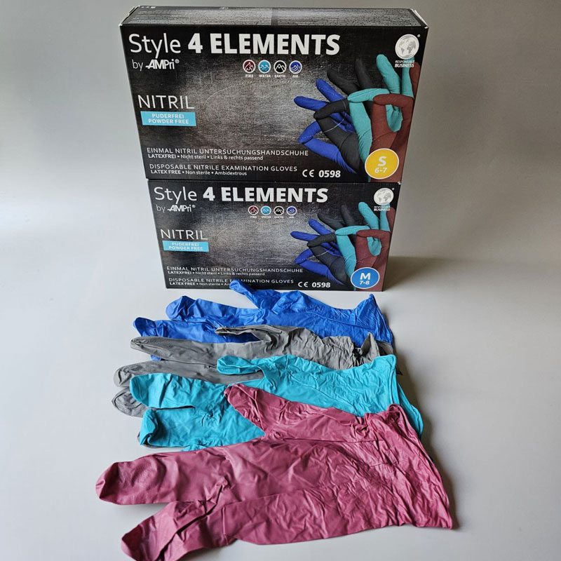 Разноцветные нитриловые одноразовые перчатки AMPri Style 4 Elements – отличный выбор для тех, кому в работе необходима чувствительность рук и высокий уровень безопасности от всяческих загрязнений и повреждений.