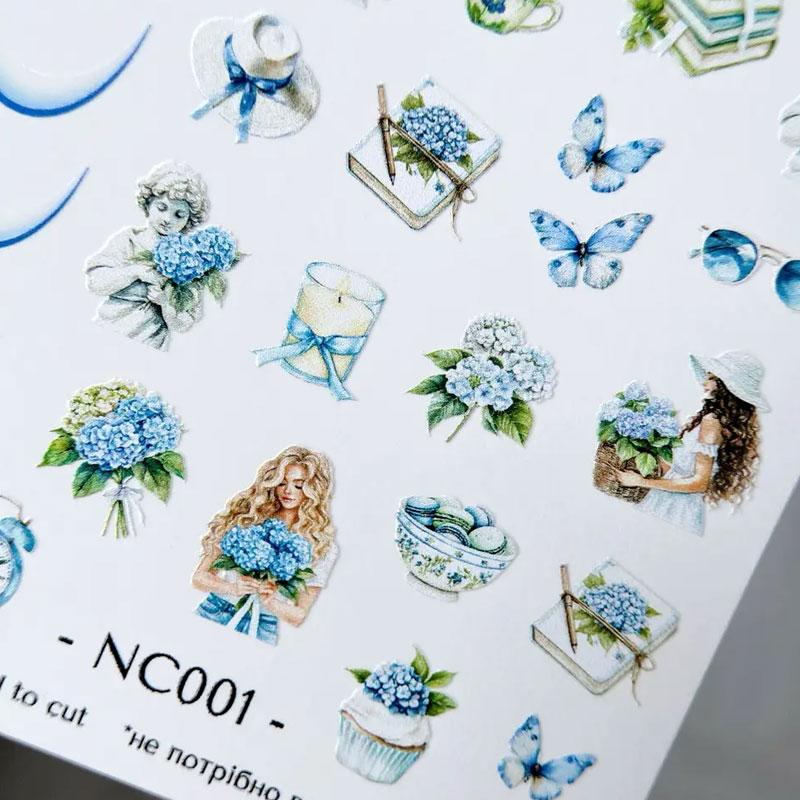 Слайдеры серии NC не нужно вырезать, они уже без лишней пленки, пленка только по форме изображения. Достаточно размочить слайдер или предварительно вырезанную группу элементов на влажной салфетке 10 сек. Кисточкой смоченной в гелевой базе, так чтобы она была липкая, переносим рисунок на ноготь. Закрепляются такие слайдеры так же, как обычные.