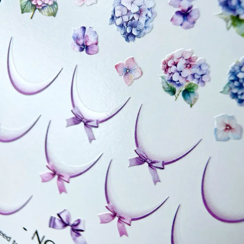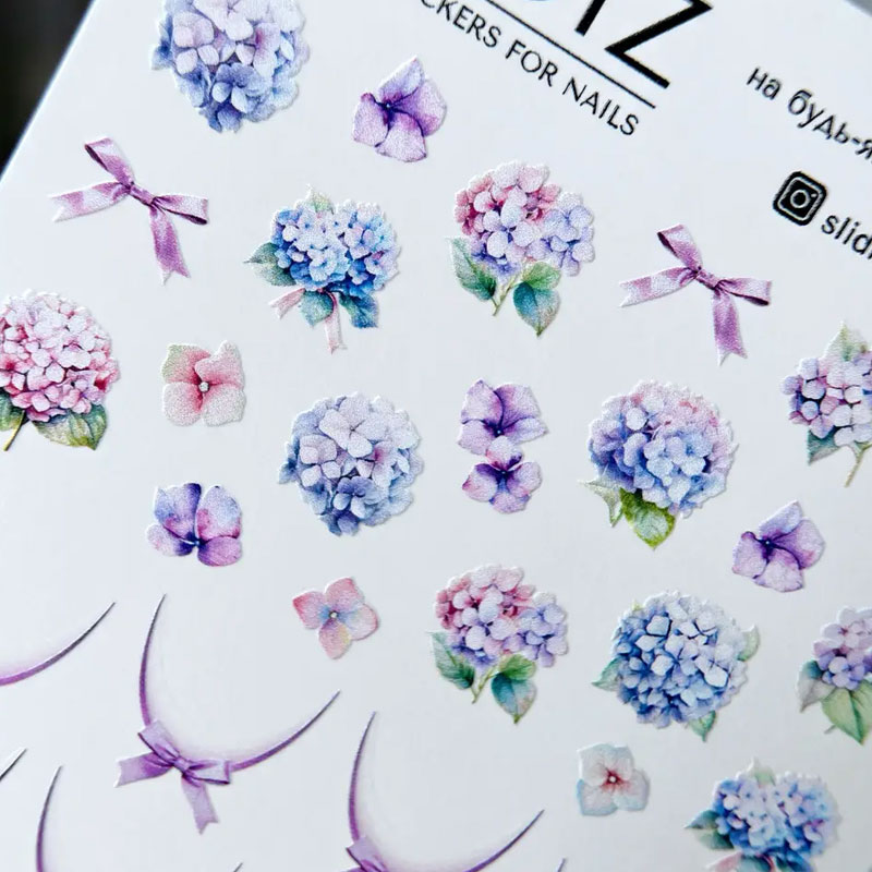Слайдеры серии NC не нужно вырезать, они уже без лишней пленки, пленка только по форме изображения. Достаточно размочить слайдер или предварительно вырезанную группу элементов на влажной салфетке 10 сек. Кисточкой смоченной в гелевой базе, так чтобы она была липкая, переносим рисунок на ноготь. Закрепляются такие слайдеры так же, как обычные.