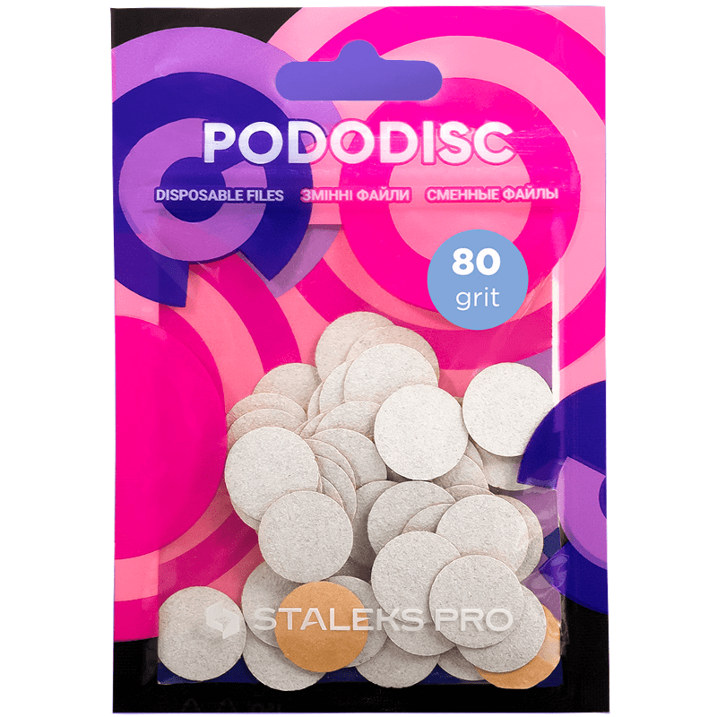 Набор Staleks Pro PodoDisc S – это 50 одноразовых шлифовальных накладок на небольшой педикюрный диск. Простые в использовании, эффективные и крепкие, они позволяют качественно прорабатывать труднодоступные участки и локально подбирать жесткость для отдельных маленьких зон.