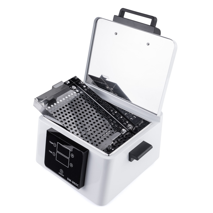 Сухожаровой шкаф SM-360C предназначен для стерилизации маникюрных и педикюрных инструментов. Внутренний блок термического стерилизатора изготовлен из нержавеющей стали. Внутри прибора есть специальный съемный лоток для хранения и стерилизации инструмента.