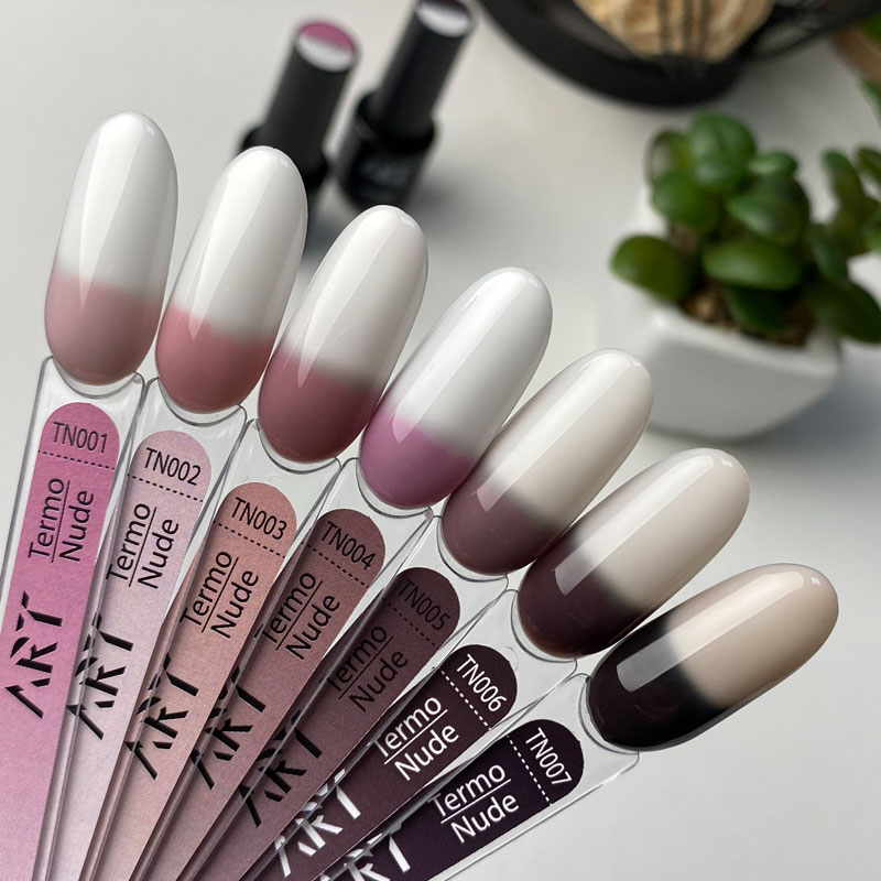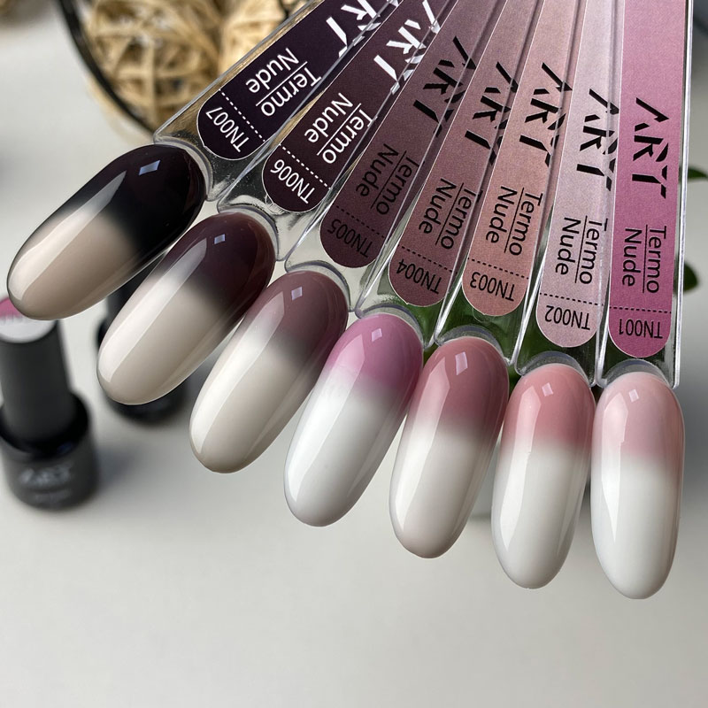 ART Termo Nude - коллекция термо гель-лаков, которые имеют невероятно стильные оттенки, которые становятся насыщеннее под воздействием холодной температуры, и становятся светлыми пдо воздействием тепла. Гель-лаки прекрасно самовыравниваются при нанесении, распределяется, не растекается и скрывают дефекты ногтевой пластины.