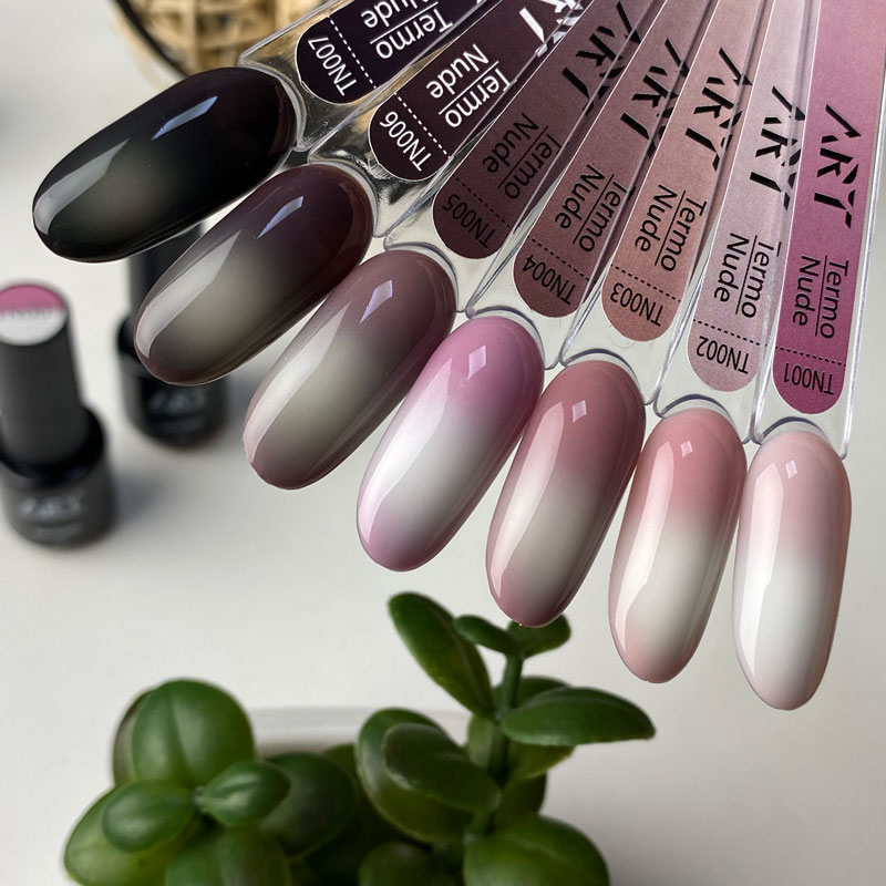 ART Termo Nude - коллекция термо гель-лаков, которые имеют невероятно стильные оттенки, которые становятся насыщеннее под воздействием холодной температуры, и становятся светлыми пдо воздействием тепла. Гель-лаки прекрасно самовыравниваются при нанесении, распределяется, не растекается и скрывают дефекты ногтевой пластины.
