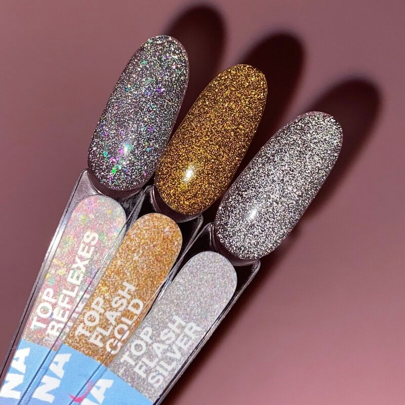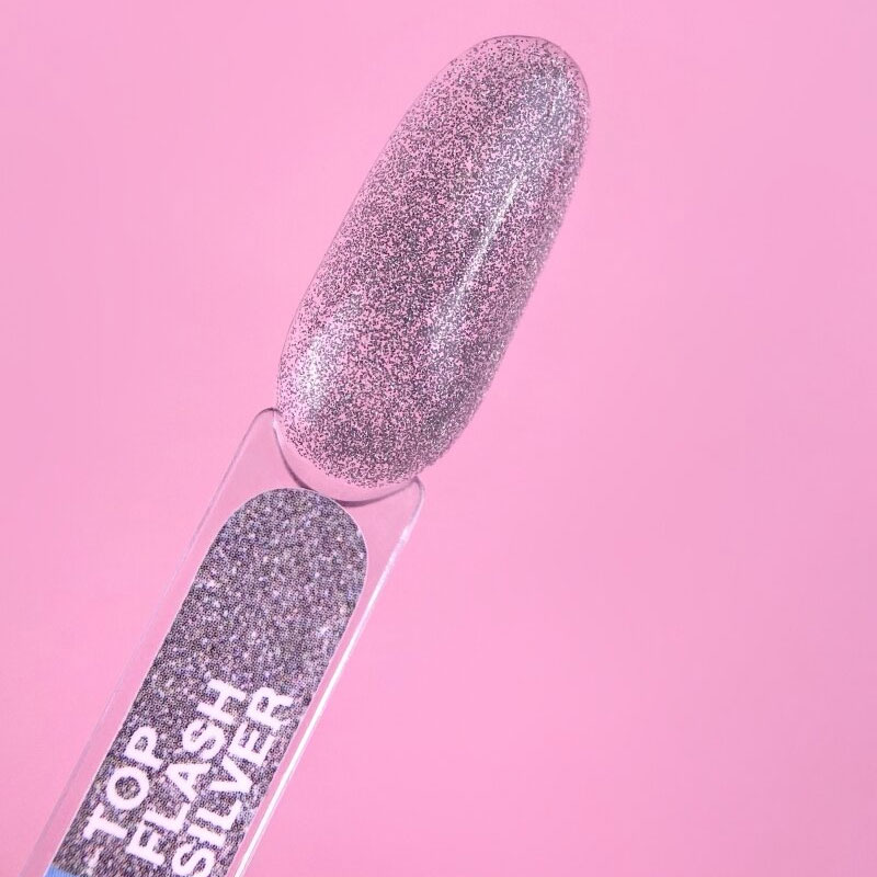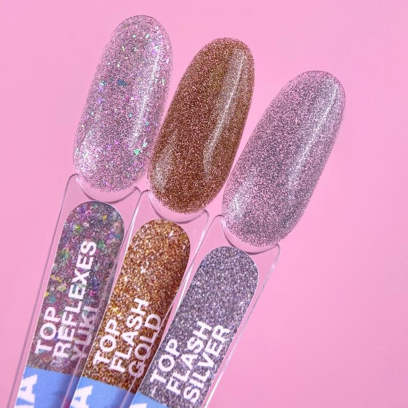 TOP Flash Gold – это светоотражающий ТОП с декоративными элементами серебристого оттенка, без липкого слоя, который будет гармонично смотреться с любым цветом на ногтях. Он способен сделать маникюр интересным и необычным.