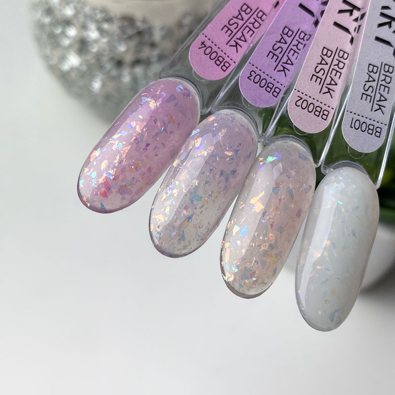 ART Break Base – камуфлююча база для гель-лаку з частинками голограмної слюди, що створює неймовірні переливи. У палітрі 4 універсальні відтінки, які точно не лежатимуть без діла. База рівномірно розподіляється по нігтьової пластині і не тече, еластична, не сколюється і не тріскається при тривалій носінні.
