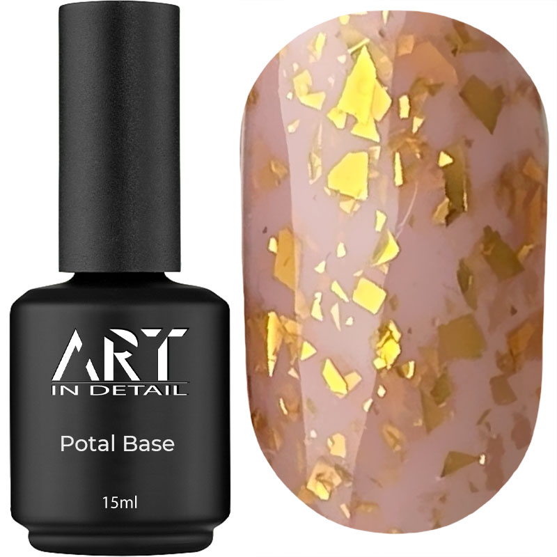 ART Potal Base – це база для гель-лаку , яка успішно виконує функцію основного декоративного покриття та значно прискорює сам процес нейл-дизайну. Особливістю основи з поталлю є унікальна текстура. Поталь є імітацією сусального золота, вона дуже тонка і делікатна. У поєднанні з кольоровою основою баз цей матеріал виглядає дуже красиво.