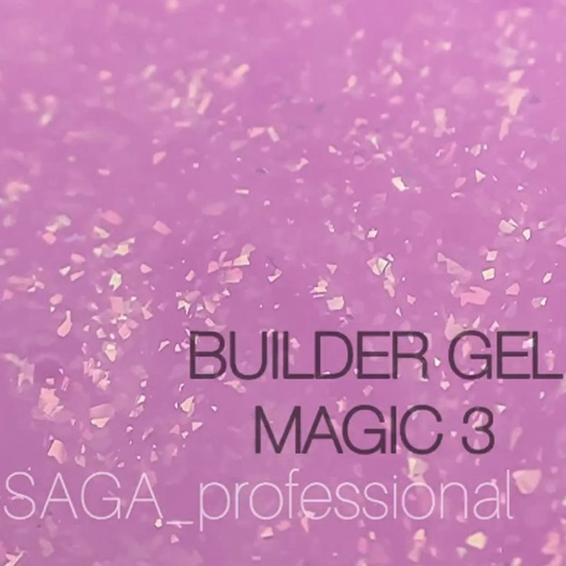 Saga Professional Magic Builder Gel - лінійка твердих (жорстких), не гнучких гелів, розроблених для нарощування та зміцнення нігтів. Мають середню по густоті консистенцію, самовирівнюються, мінімальний опил, також адаптовані до роботи в техніці "без опила". Наносяться на підкладку (виробник рекомендує як підкладку застосовувати базу Soft Base). Перед нанесенням топу залишкову липкість із гелю Magic Builder Gel краще зняти.