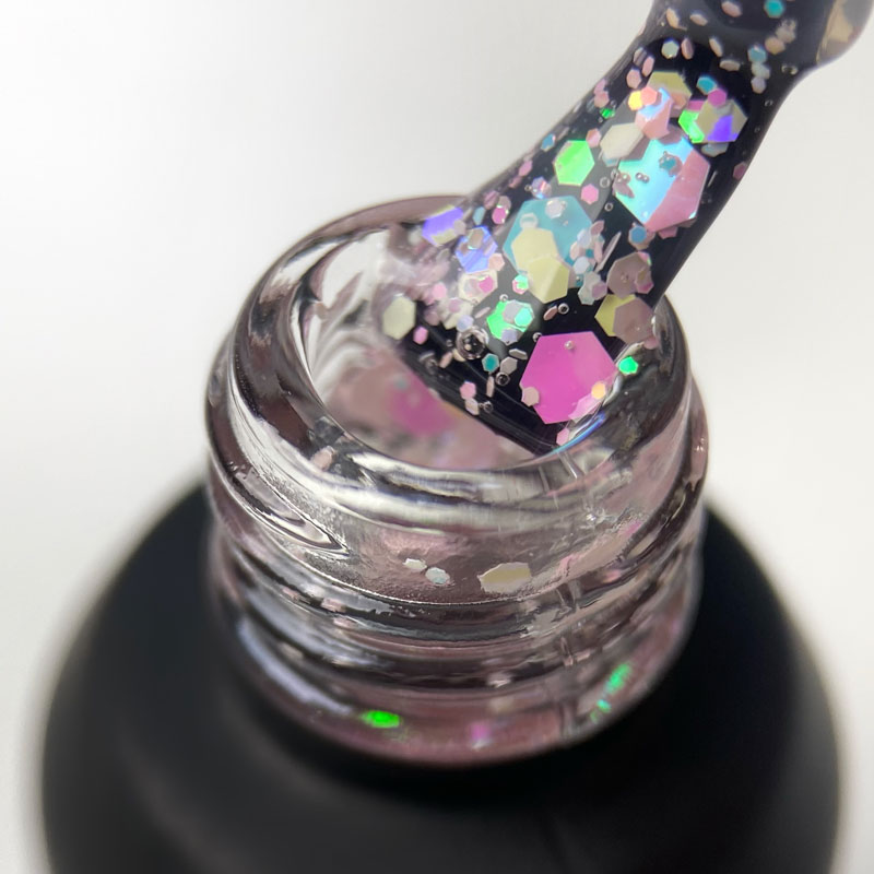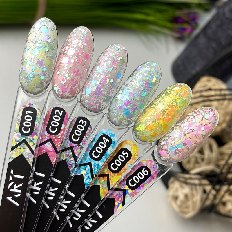 ART Confetti - колекція гель-лаків на прозорій основі з яскравими шестигранниками, що переливаються. Колекція ідеально підійде для літніх та яскравих дизайнів. Як підложку можна використовувати кольорові гель-лаки або бази, а також нанести самостійно, покриваючи в два тонкі шари.