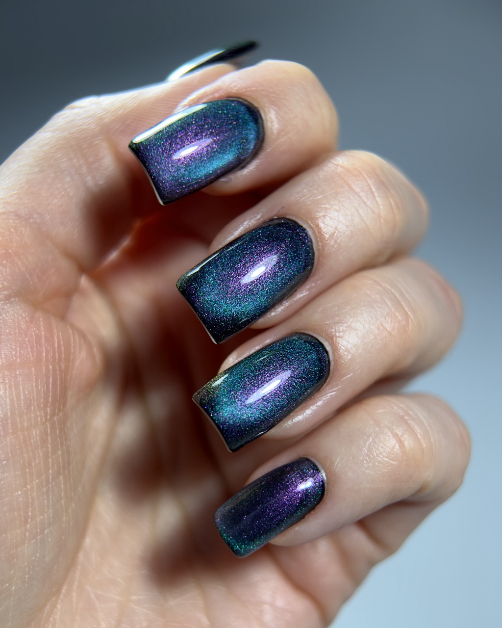 - Нанесіть гель-лак Galaxy Cat та зробіть магнітом бажаний ефект "котячого ока", полімеризуйте в LED-лампі 60-90 секунд, в UV-лампі – 180-240 секунд.