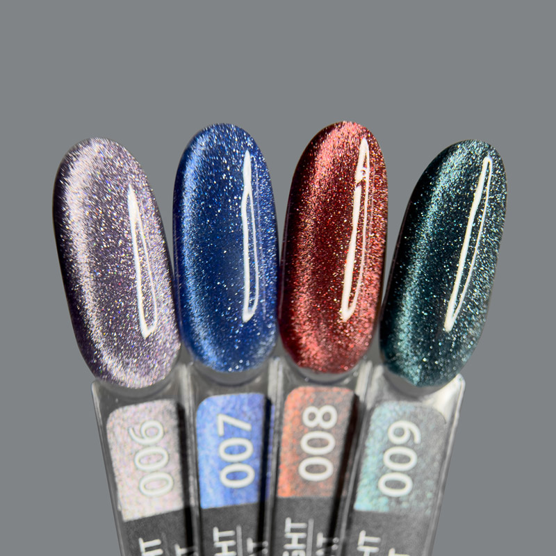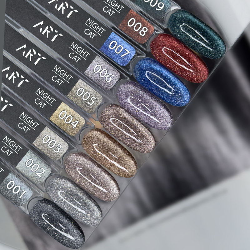 ART Night Cat - колекція світловідбивних гель-лаків з ефектом котячого ока. Створюють абсолютну магію на нігтях, за рахунок блискучих магнітних та світловідбивних частинок які під впливом магніту перетворюються в граціозні мерехтливі лінії. Гель-лаки ART Night Cat при звичайному освітленні дарують багатогранний шимерний блиск, при потраплянні прямого яскравого світла починають випромінювати зачаровуюче сяйво. Гель-лаки добре пігментовані, перекривають нігтьюву пластину в 1 або 2 тонких шари. Не рекомендується ноносити занадто товстим шаром.