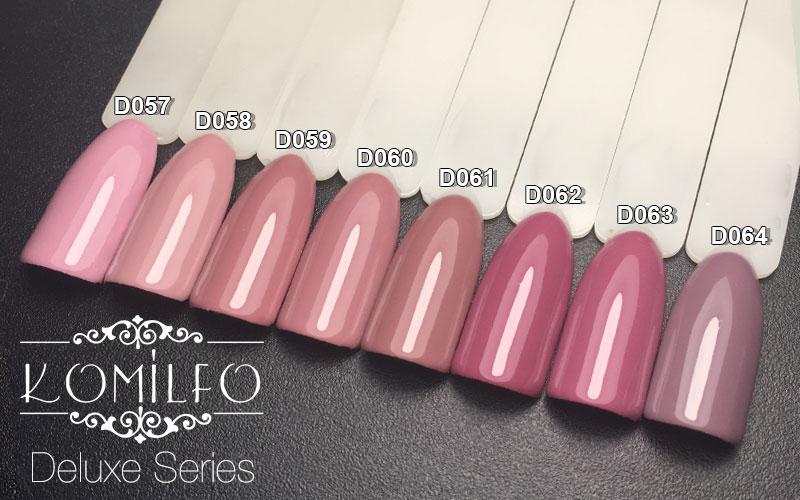 Komilfo Deluxe Series — це дуже пігментовані гель-лаки, щільно лягають, зносостійкі, зручні у нанесенні, самовирівнюються по нігтьовій пластині, легкорозчинні, ароматизовані та чудово поєднуються з продукцією інших виробників!