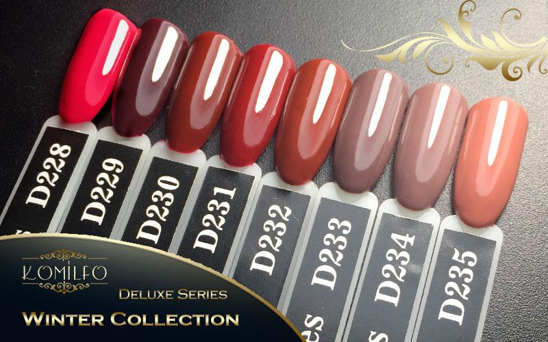 Komilfo Deluxe Series — це дуже пігментовані гель-лаки, щільно лягають, зносостійкі, зручні у нанесенні, самовирівнюються по нігтьовій пластині, легкорозчинні, ароматизовані та чудово поєднуються з продукцією інших виробників!