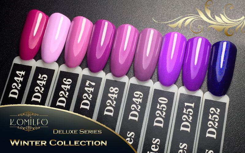 Komilfo Deluxe Series — це дуже пігментовані гель-лаки, щільно лягають, зносостійкі, зручні у нанесенні, самовирівнюються по нігтьовій пластині, легкорозчинні, ароматизовані та чудово поєднуються з продукцією інших виробників!