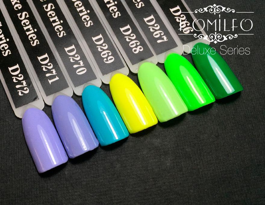 Komilfo Deluxe Series — це дуже пігментовані гель-лаки, щільно лягають, зносостійкі, зручні у нанесенні, самовирівнюються по нігтьовій пластині, легкорозчинні, ароматизовані та чудово поєднуються з продукцією інших виробників!