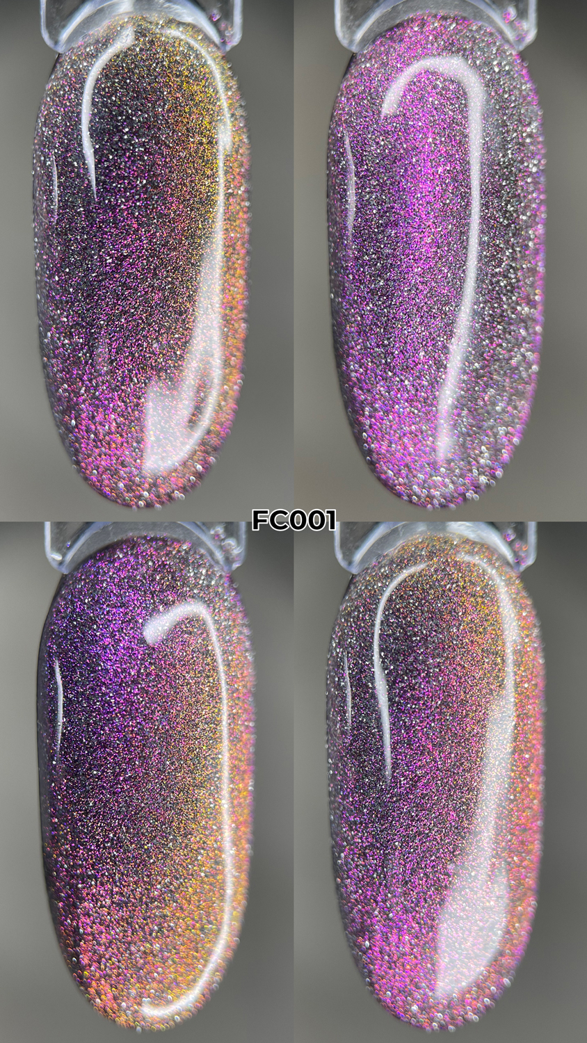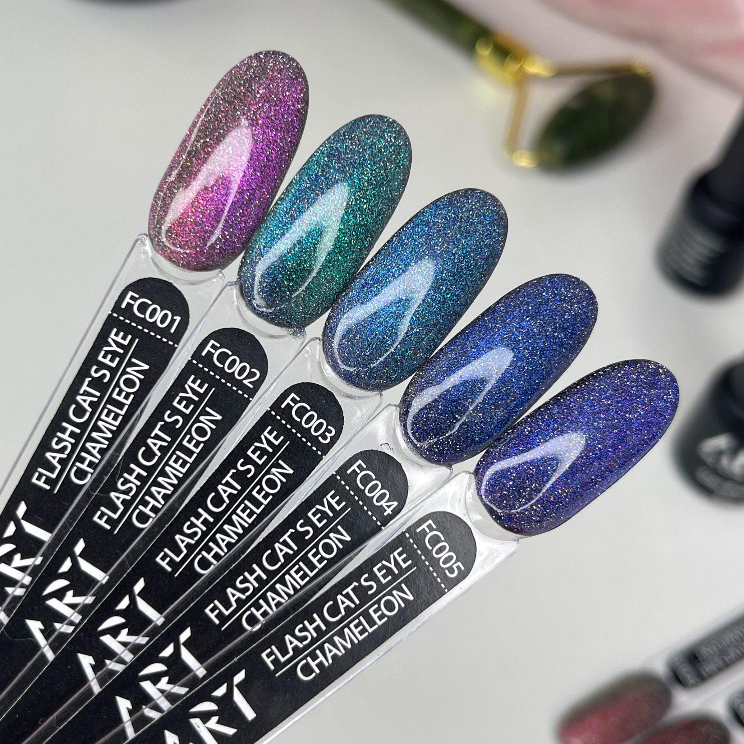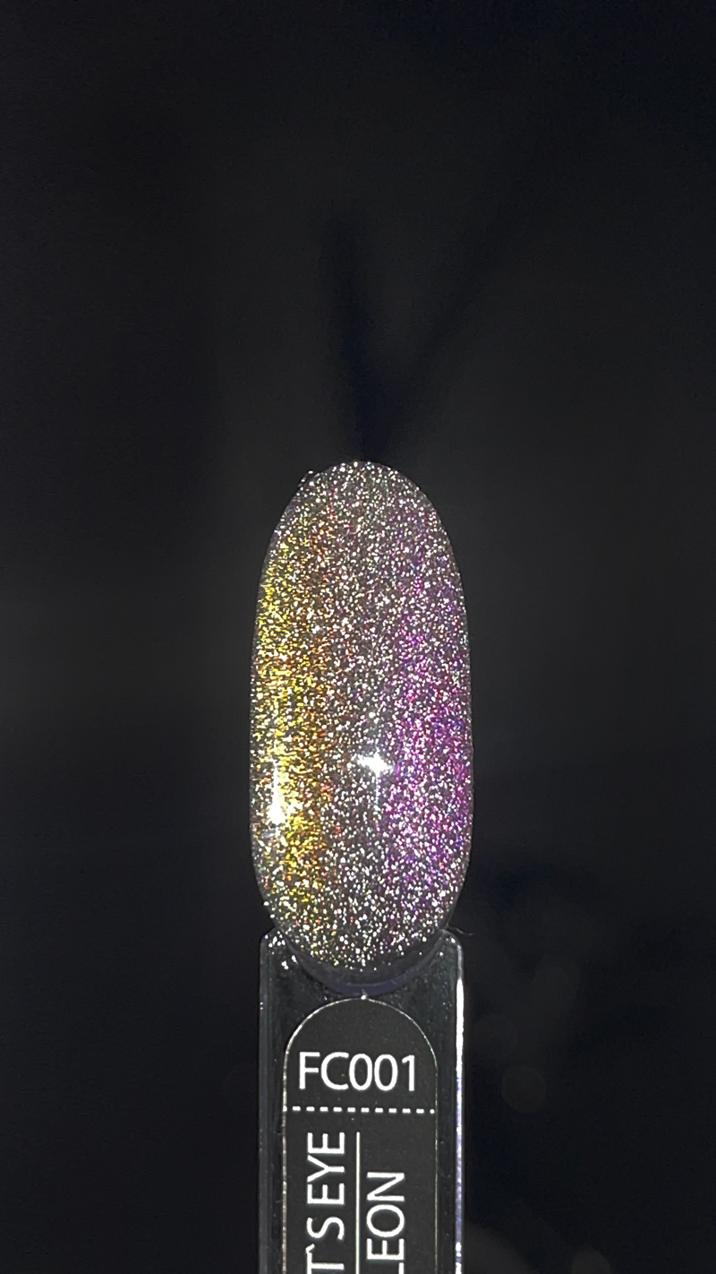 Унікальність колекції ART Flash Cat Chameleon у тому, що при попаданні яскравих променів у темному приміщенні – світловідбиваючі частинки розіллються яскравим сяйвом на ваших нігтях. При стандартному освітленні покриття буде грати в променях світла і переливатися, залежно від кута нахилу.