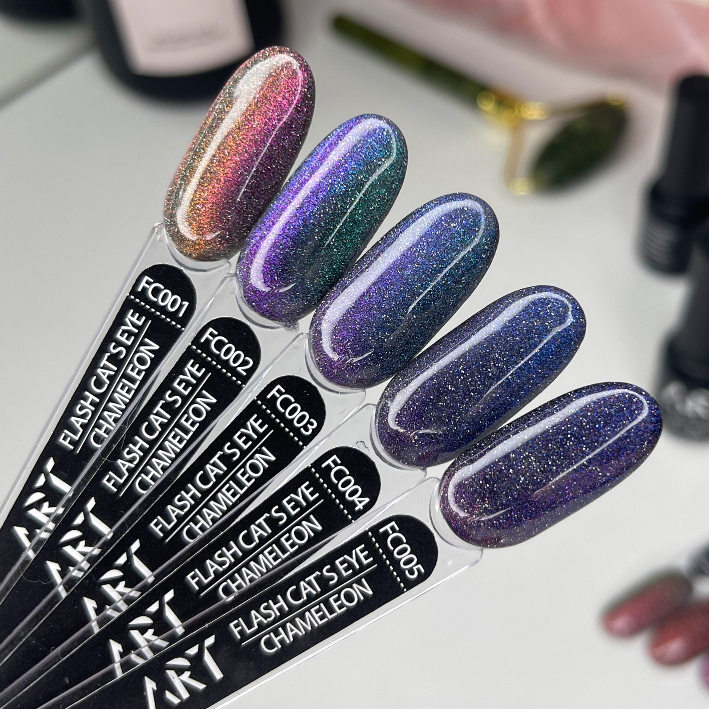 Унікальність колекції ART Flash Cat Chameleon в тому, що при попаданні яскравих променів у темному приміщенні - частки, що відбивають світло, розіллються яскравим сяйвом на ваших нігтях. При стандартному освітленні покриття буде грати в променях світла і переливатися, залежно від кута нахилу.