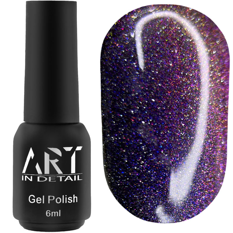 ART Flash Cat Chameleon - колекція магнітних гель-лаків, які містять тисячі дрібних блискіток-хамелеонів та світловідбиваючі частинки. Гель-лак має напівпрозору текстуру і для яскравості рекомендуємо використовувати на темну підкладку. При стандартному нанесенні ви отримаєте рівномірне мерехтіння, а для вираженої смуги, місячних і чарівних візерунків - використовуйте різні типи магнітів.